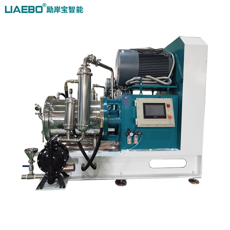 經預處理的液-固物料泵送入裝有高耐磨研磨珠介質的磨筒內,由高速旋轉的圓盤式不銹鋼葉片帶動,研磨珠對物料產生強烈剪切、碰撞、擠壓作用,分散盤對聚集體再次分散,迅速達到細化顆粒的效果,由動態